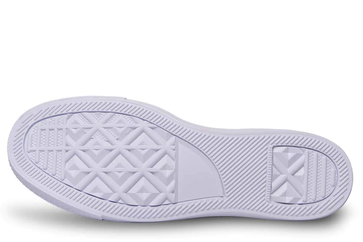 Style: Rounded toe, accompanied by flat canvas laces featuring metallic eyelets, mirroring the pristine hue of the sole.